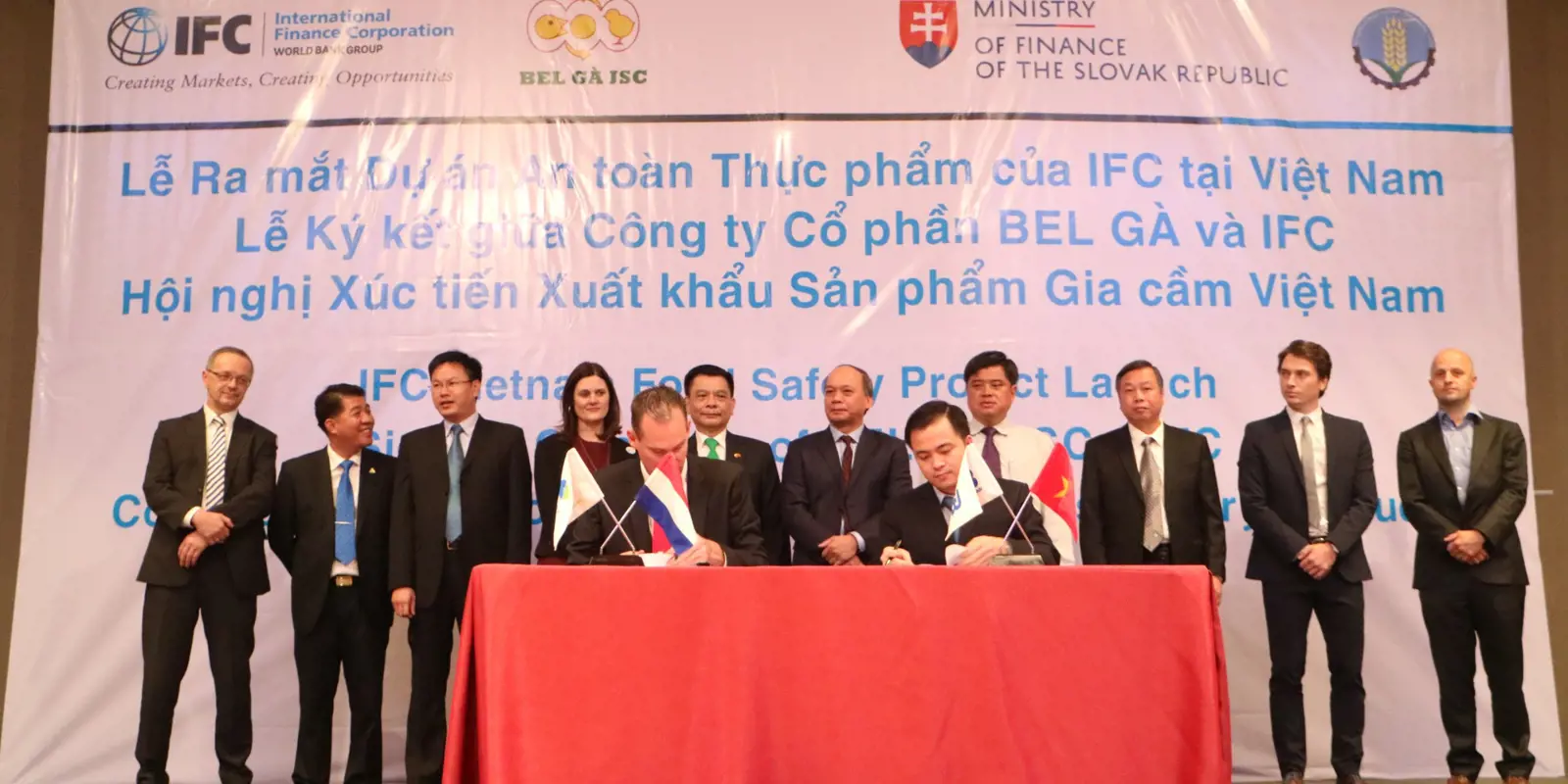 Vào ngày 01 tháng 07 năm 2017, trong khuôn khổ của Hội Nghị Xúc Tiến Xuất Khẩu Sản Phẩm Gia Cầm Việt Nam & Lễ ra mắt Chương trình An Toàn Thực Phẩm tại Việt Nam được đồng tổ chức bởi Bộ Nông Nghiệp và Phát Triển Nông Thôn (Bộ NNPTNT) và IFC Việt Nam, thành viên của nhóm Ngân Hàng Thế Giới, công ty TNHH De Heus (De Heus Việt Nam) đã tham gia kí kết những biên bản ghi nhớ liên quan đến việc triển khai áp dụng tiêu chuẩn quốc tế GlobalG.A.P. trong chăn nuôi; Cung cấp các giải pháp tài chính; Xây dựng và triển khai hệ thống phần mềm quản lý và truy xuất nguồn gốc cho các trang trại trong chuỗi liên kết sản xuất gia cầm sạch hướng đến xuất khẩu. Lễ kí kết được diễn ra dưới sự chứng kiến của Ông Vũ Văn Tám và Ông Trần Thanh Nam, Thứ Bộ trưởng Bộ NN & PTNT, Ông Arie Veldhuizen, Tham Tán Nông Nghiệp Vương Quốc Hà Lan tại Việt Nam, Bà Sarah Ockman, Giám đốc Chương trình An Toàn Thực Phẩm (ATTP) toàn cầu của IFC, Ông Hồ Huy, Tổng Lãnh Sự Danh Dự Nước Cộng Hoà Slovakia tại TPHCM, Ông Huỳnh Anh Minh, Phó Chủ Tịch UBND Tỉnh Bình Phước, Ông Hà Trọng Khiêm, Phó Tổng Giám Đốc Ngân Hàng TMCP Quân Đội và các đối tác có liên quan.