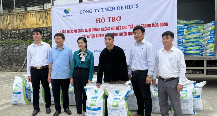 Sáng 24/11/2022, đại diện Công ty TNHH De Heus (Hà Lan), cùng Trung tâm Khuyến nông Quốc Gia (Bộ NNPTNT) phối hợp với Sở Nông nghiệp và PTNT tỉnh Tuyên Quang trao tặng 10 tấn thức ăn chăn nuôi phòng chống đói rét cho trâu bò trong mùa đông cho đồng bào vùng cao tại trung tâm văn hóa huyện Chiêm Hóa, Tỉnh Tuyên Quang.