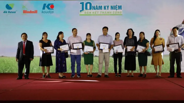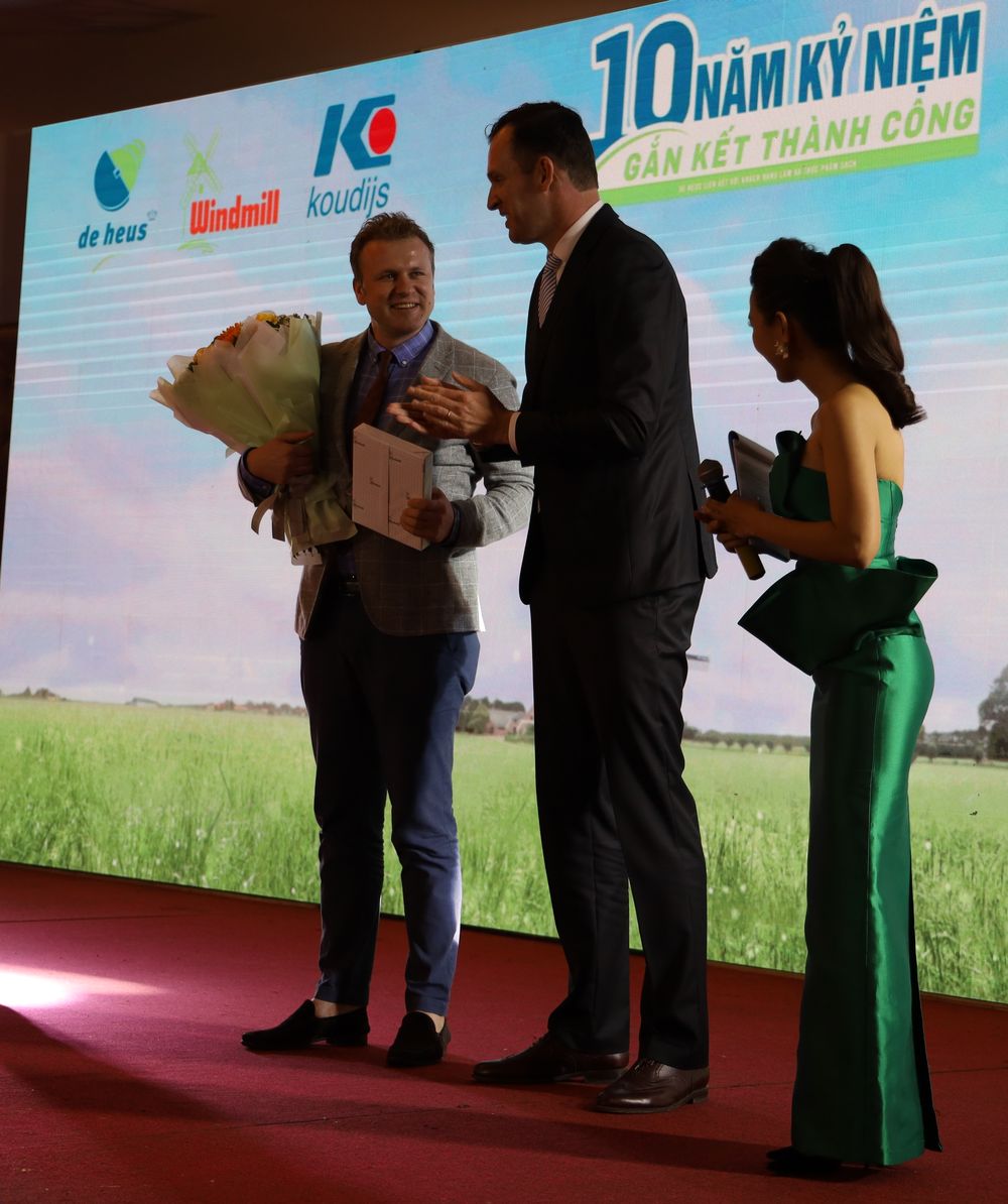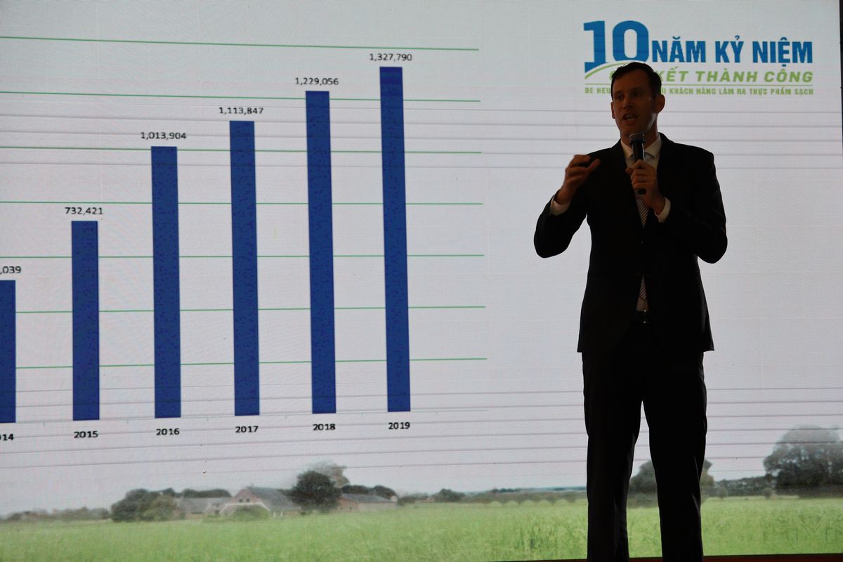 Cũng tại Hội nghị, ông Gabor Fluit - Tổng Giám Đốc De Heus khu vực Châu Á đã báo cáo tổng quát về 10 năm hoạt động của De Heus tại Việt Nam. Khởi đầu từ năm 2009 với sản lượng 42.000 tấn/năm, đến năm 2019, có sản lượng vượt mức 1.300.000 tấn/năm, qua 10 năm sản lượng tăng trưởng 3.095%, bình quân một năm tăng trưởng 310%. Để đạt được con số tăng trưởng ấn tượng đó chính là nhờ vào sự tin dùng sản phẩm De Heus của quý đại lý, quý trang trai trong hơn 10 năm qua. Mặt khác, với phương châm sản xuất kinh doanh “De Heus liên kết với người chăn nuôi làm ra thực phẩm sạch”.Do vậy, De Heus luôn sát cánh cùng người chăn nuôi trong những lúc khó khăn cũng như lúc thuận lợi… Đồng thời, ông Gabor Fluit gởi lời biết ơn sâu sắc nhất đến quý khách hàng đã và đang đồng hành cùng De Heus trong những năm qua, tiếp tục gắn kết cho những năm sau nữa…