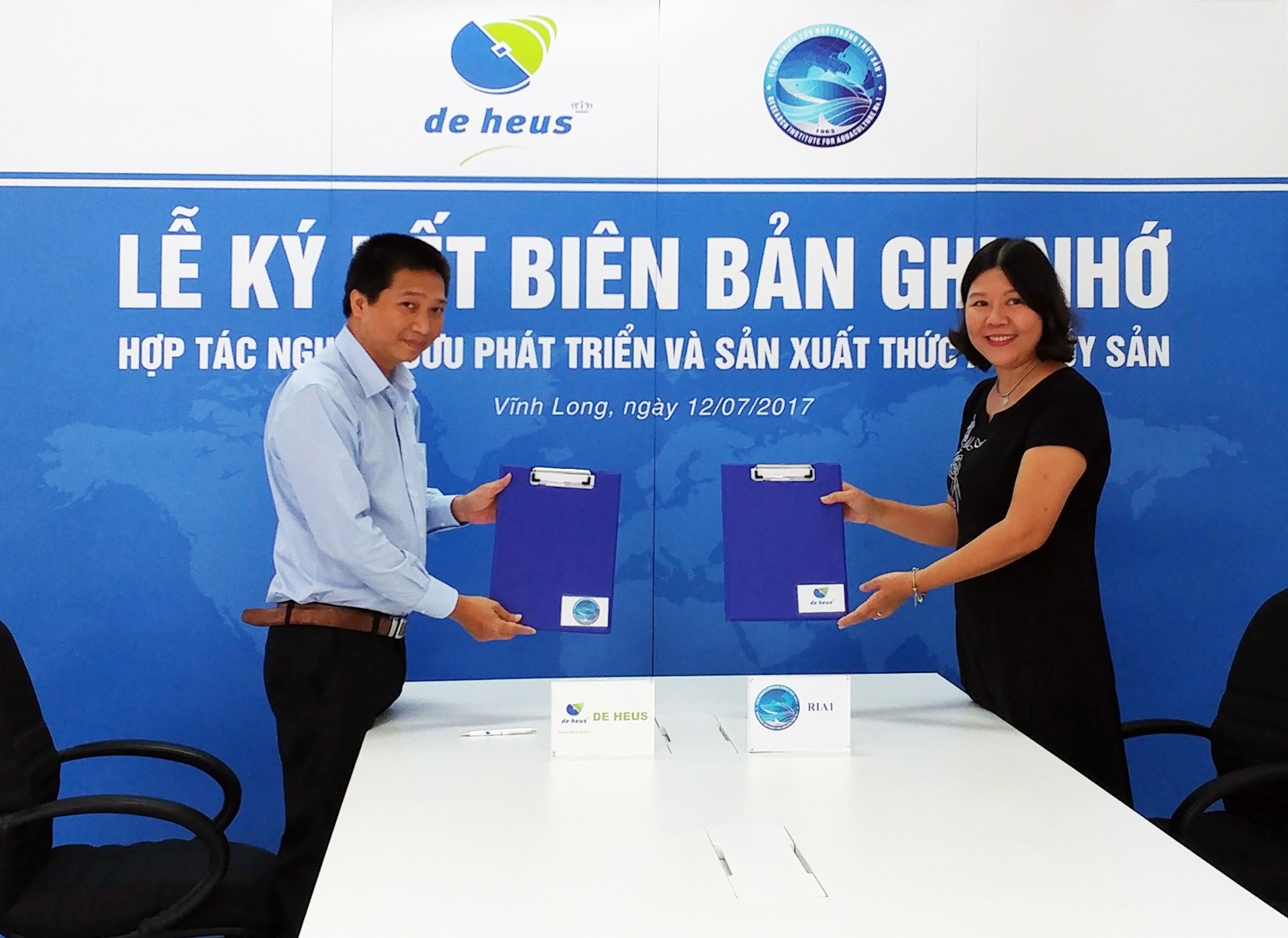 Ngày 12/07/2017, tại Trung tâm Nghiên cứu và Phát triển Thực Nghiệm Thủy Sản De Heus (Trung tâm R&D) toạ lạc tại huyện Mang Thít, tỉnh Vĩnh Long, Ông Nguyễn Quang Hiếu – Phó Tổng Giám Đốc Phụ trách kinh Doanh Công ty TNHH De Heus và bà Phan Thị Vân, Viện trưởng Viện Nghiên cứu Nuôi trồng Thuỷ sản I (RIA1) đã cùng nhau kí kết biên bản ghi nhớ hợp tác nghiên cứu sản xuất thức ăn thuỷ sản. Buổi lễ diễn ra dưới sự chứng kiến của ông Ton Hovers, Giám Đốc Phát Triển Kinh Doanh Châ u Á của De Heus cùng với đại diện từ phía RIA1.