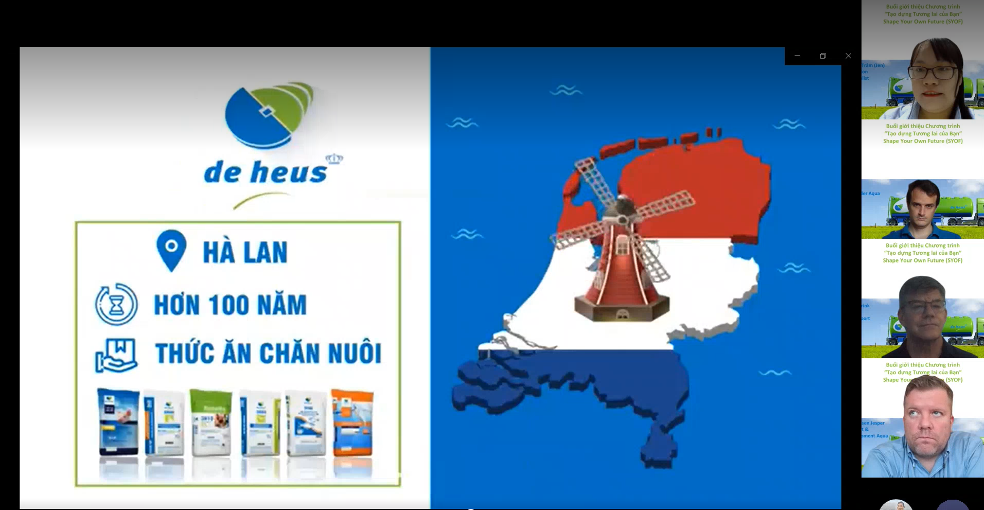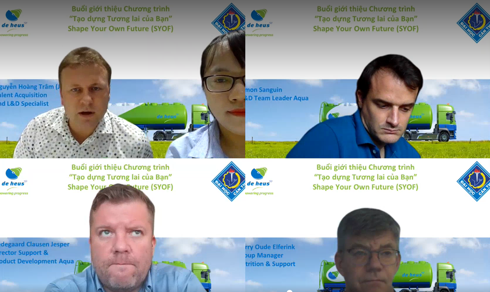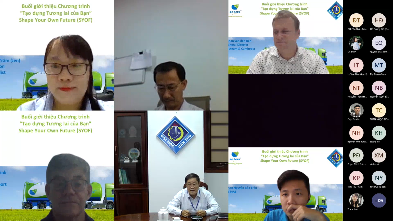 Ngày 3/12/2021, Công ty De Heus đã phối hợp với Trường Đại học Cần Thơ tổ chức giới thiệu Chương trình “Tạo dựng Tương lai của Bạn – Shape Your Own Future (SYOF)”. Sự kiện trực tuyến diễn ra trong bối cảnh dịch Covid còn diễn biến phức tạp, mở đầu buổi giao lưu không khí thật trang trọng, ấm áp với sự tham dự của Quý Thầy Cô Ban Giám hiệu, Ban Chủ nhiệm, giảng viên chuyên môn Khoa Nông Nghiệp và Khoa Thủy sản, hòa cùng sự háo hức, chào đón của các bạn Sinh viên Đại học Cần Thơ. Về phía Công ty De Heus, Chương trình cũng rất hân hạnh khi được sự tham dự của anh Johan (Tổng Giám đốc Việt Nam & Campuchia), Quý Anh/Chị Quản lý Trưởng khối Dinh dưỡng - Hỗ trợ, Kinh doanh, Kỹ thuật, Trại nghiên cứu, Marketing, Phát triển bền vững, IT cùng thành viên đội dự án SYOF đã góp phần giúp buổi giao lưu thêm thành công tốt đẹp.