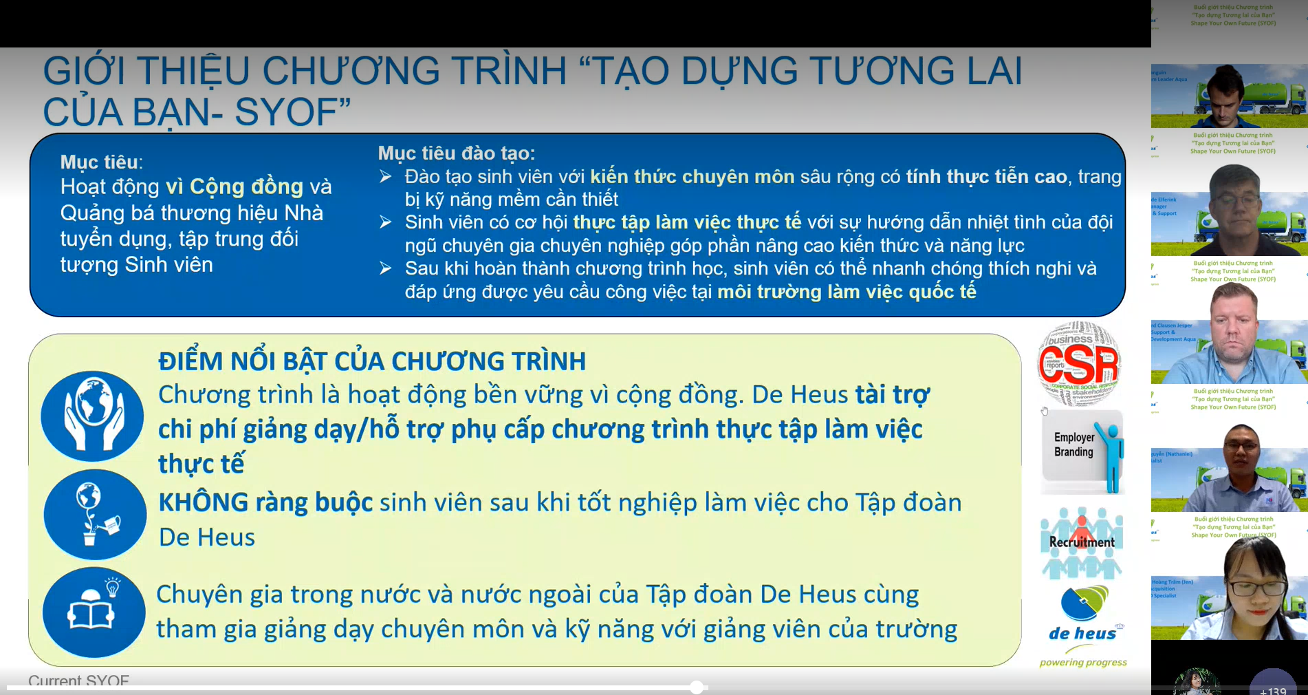 Thông qua phần giới thiệu chi tiết của De Heus, các em sinh viên có cái nhìn tổng quan về công ty cũng như Chương trình Tạo dựng Tương lai của Bạn – Shape Your Own Future (SYOF). Chương trình hướng tới mục tiêu nhằm đào tạo sinh viên với chuyên môn có tính thực tiễn cao, trang bị kỹ năng mềm cần thiết, cùng kiến thức chuyên môn sâu rộng, để vươn cơ hội nghề nghiệp ra tầm quốc tế. Hơn thế nữa, ngay tại buổi lễ, các em sinh viên cũng có thể trao đổi, giao lưu để giải tỏa những thắc mắc về chương trình tuyển sinh mới, cách thức đăng kí…
